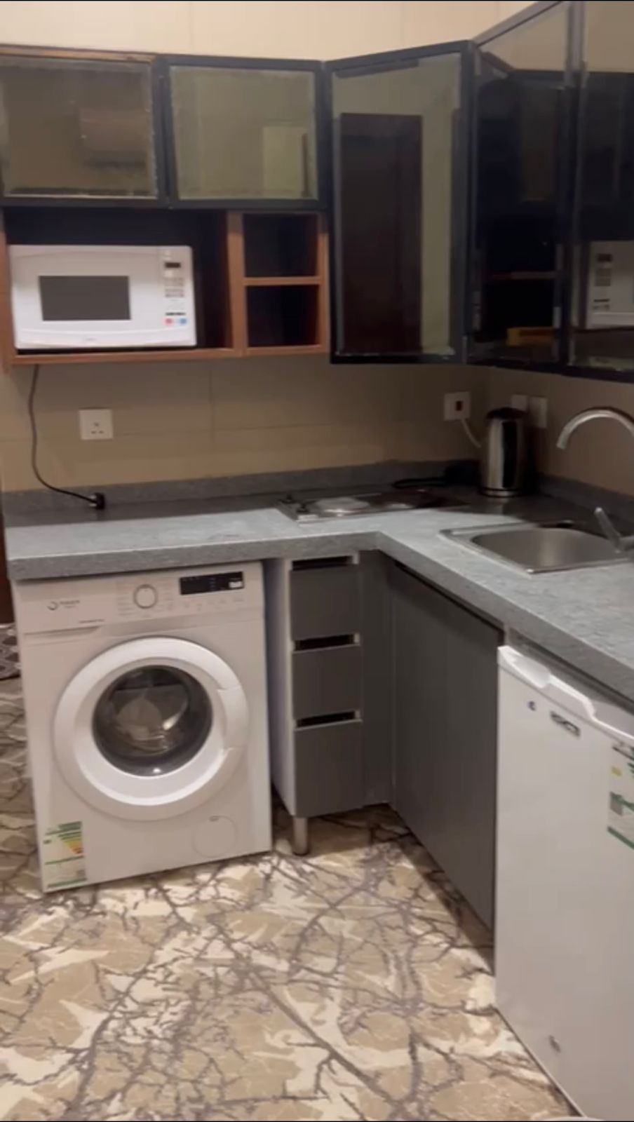 مغاسل، مطبخ راكب، غسالة، ثلاجة، مايكرويف، خزنات، وأثاث فاخر كامل