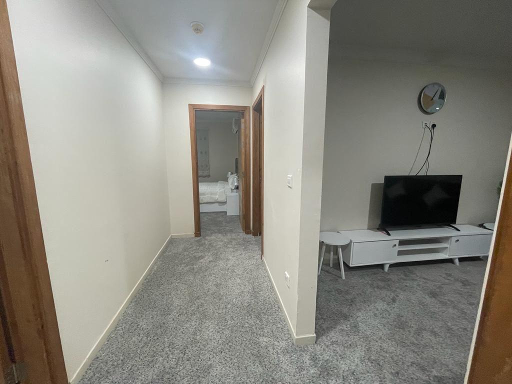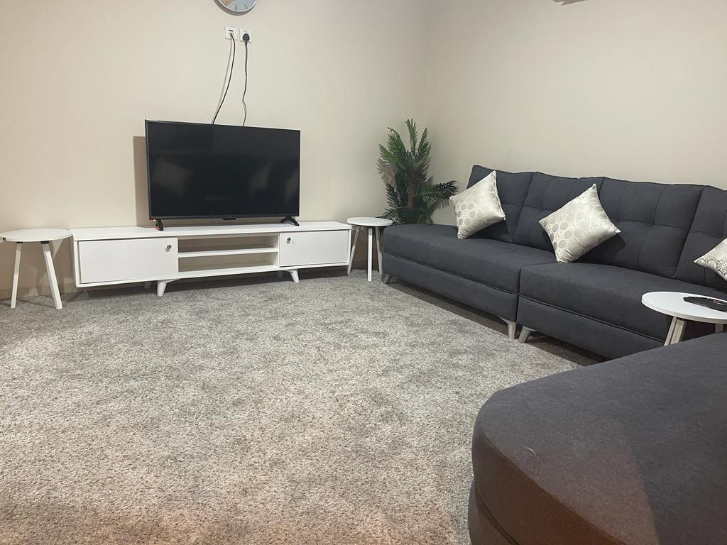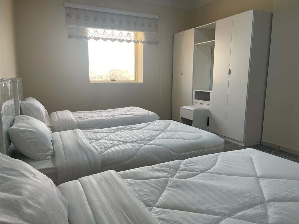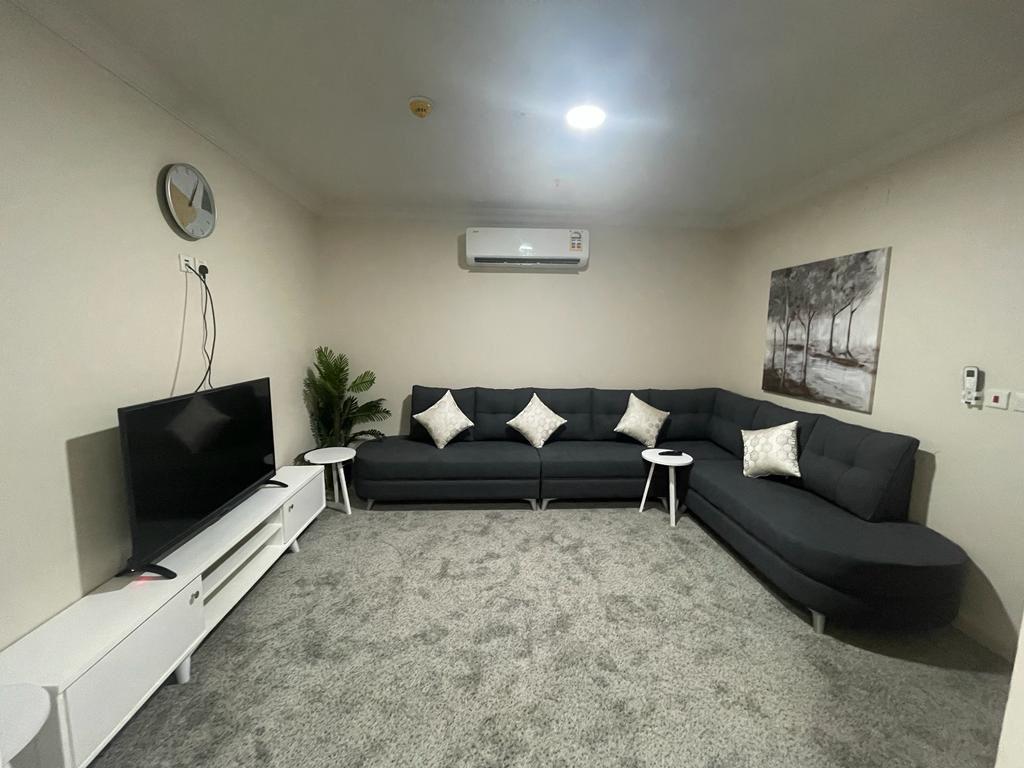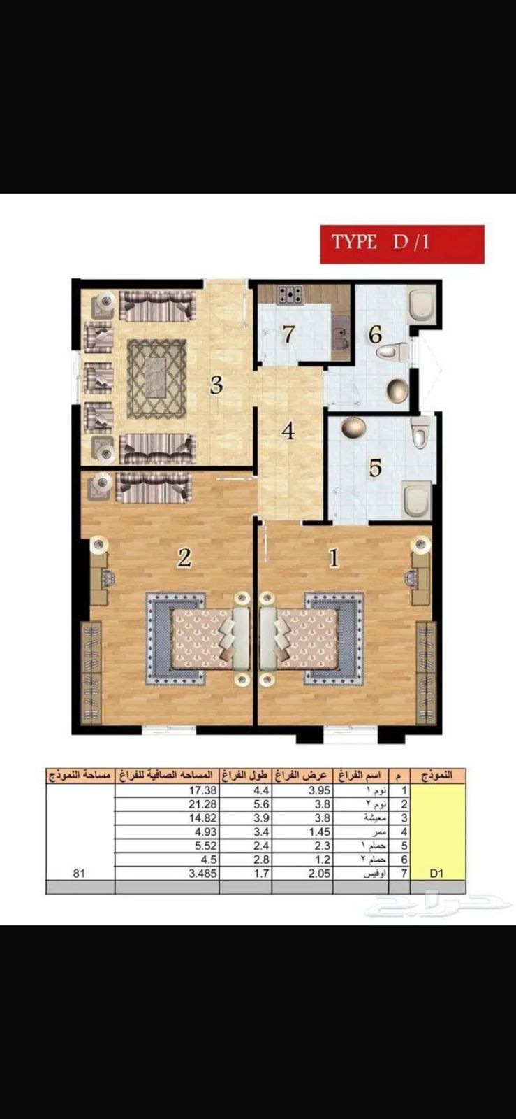 التقسيم: 2 غرفة نوم + صالة معيشة + مطبخ (أوفيس) + 2 دورة مياه.